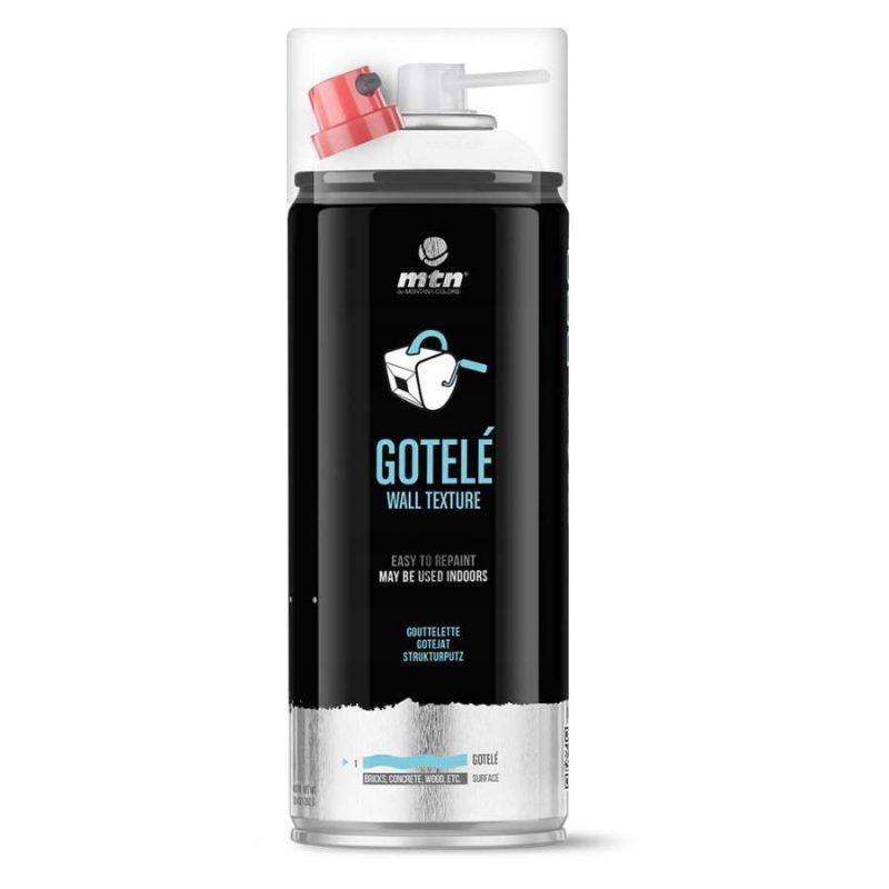 Spray Gotelé marca Montana. El MTN PRO Gotelé es una pintura formulada a base de una exclusiva dispersión de poliuretano, que imita de forma fácil y sencilla la estructura del gotelé (técnica decorativa que imita las gotas de la lluvia en el cristal). Ideal para la renovación y reparación de este tipo de estucado muy usado en los años 80 y 90 en España.