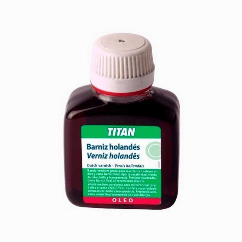 El barniz holandés, de Titan, se utiliza como barniz de cuadros produciendo acabados de alta calidad, al estilo de los cuadros flamencos, y también para prevenir cuarteados. Al mezclarlo con los colores al óleo, les proporciona vida, secatividad, solidez, flexibilidad y brillo. Se trata de un barniz de tipo graso que aviva las tonalidades consiguiendo efectos de gran transparencia.