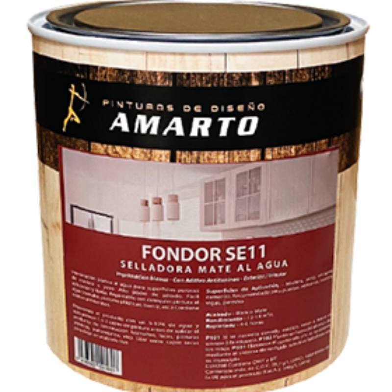 Pasta mate selladora al agua Fondor SE11. Marca Amarto. Imprimación blanca al agua para superficies porosas de madera o yeso. Alto poder de sellado. Fácil aplicación y lijado. Repintable con cualquier pintura al agua (esmalte, pinturas plásticas, barniz, etc.) Contiene aditivo antitaninos.
